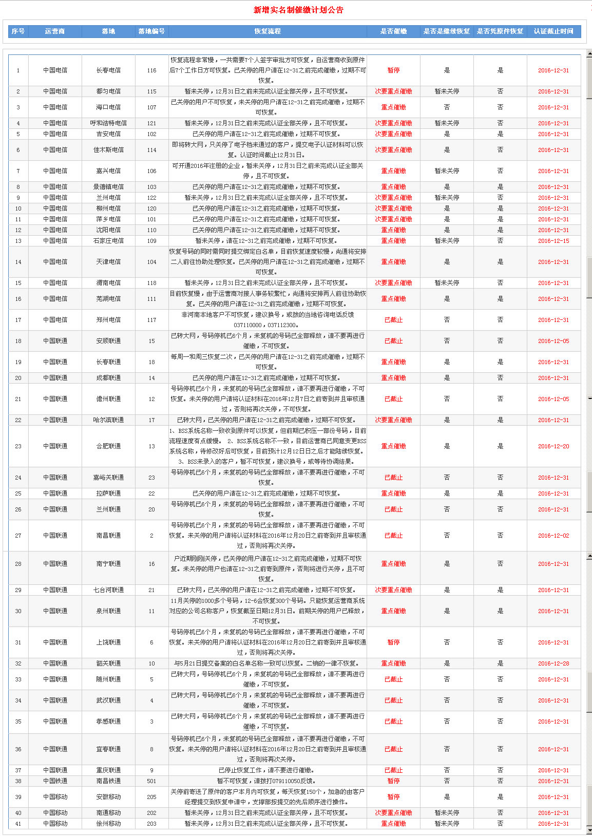 400电话实名工作倒计时-各落地恢复情况表